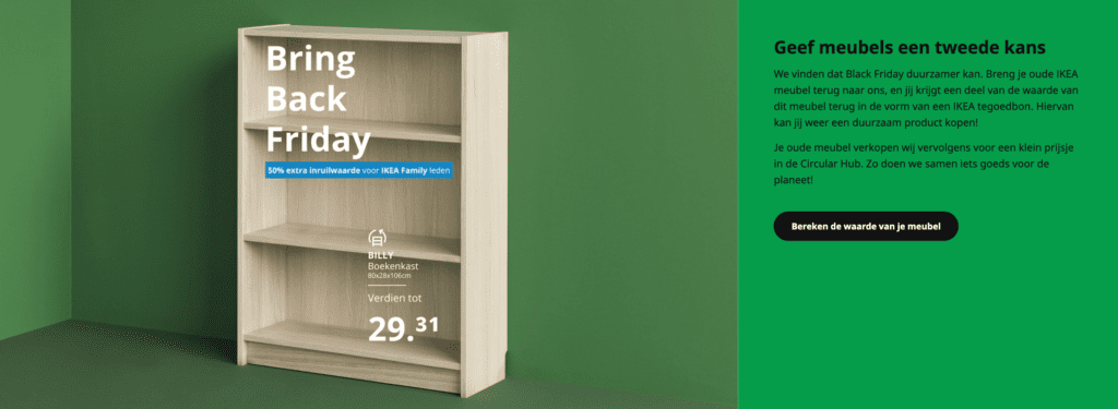 IKEA, de bekende Zweedse meubelgigant, heeft een alternatief voor Black Friday in het leven geroepen; Bring Back Friday. Black Friday staat er namelijk om bekend dat er sprake is van overconsumptie. IKEA wil dit tegengaan door in plaats van te zorgen dat mensen alsmaar meer kopen, te zorgen dat ze op deze dag bijdragen aan circulariteit. Dit initiatief sluit erg mooi aan bij de duurzaamheidsmissie van IKEA. Het bedrijf wil namelijk in 2030 volledig circulair zijn. Met Bring Back Friday willen ze consumenten inspireren hieraan mee te werken.