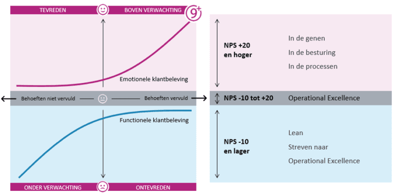 Veel organisaties zijn best blij met een score van een ruime 7 of kleine 8 voor hun klant- of medewerkerstevredenheid. “We doen het best goed, want ze zijn toch tevreden” is dan het denken. Maar is dat wel zo? Het wetenschappelijk onderbouwde antwoord op deze vraag is: Nee! Amerikaans onderzoek (Harvard Business Review, 1995) levert het interessante inzicht dat ‘tevreden’ klanten in de regel vaak vooral onverschillige klanten zijn omdat je doet wat ze van je verwachten, niks meer en niks minder. Pas als er sprake is van een (zeer) hoge mate van tevredenheid (een cijfer van meer dan 9 op een schaal van 10) blijken klanten echt betrokken te raken bij jouw organisatie.